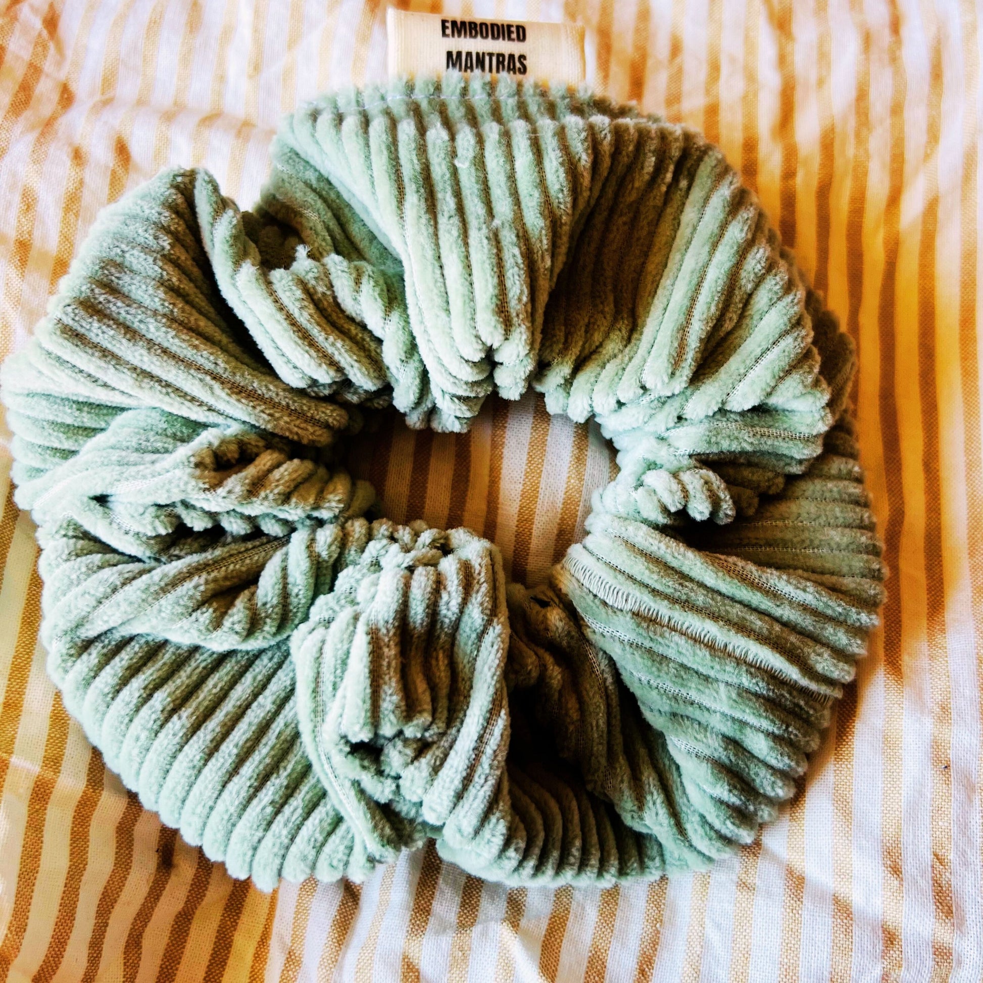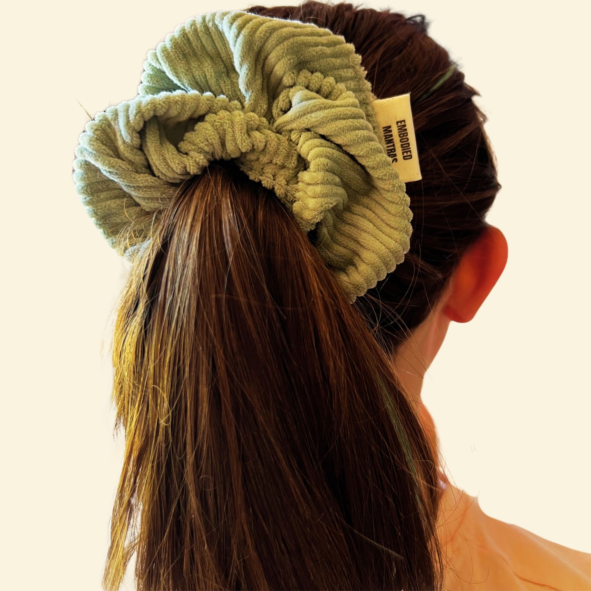 Premium XL scrunchie, soft corduroy. Each scrunchie comes with a mantra word on its label. This collection's mantra is unapologetic.